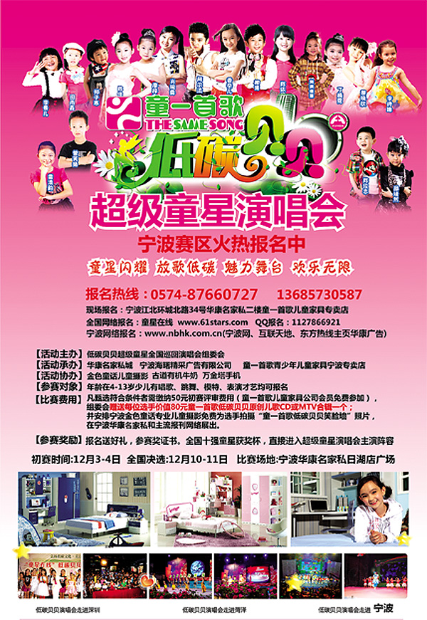由著名童星林妙可、阿尔法、柳博、香奈儿等群星演唱的环保主题歌曲《低碳贝贝》风靡网络,成为了宣传低碳环保的经典歌曲,为了更好传唱以《低碳贝贝》为代表的一大批原创少儿歌曲,给孩子们一个展示自我的舞台,为宁波孩子创造和自己的偶像明星一起参加大型童星演唱会的机会,通过活动挖掘一大批优秀少儿演艺人才,由“童一首歌青少年儿童家具”低碳贝贝超级童星全国巡回演唱会组委会主办,华康名家私、童一首歌青少年儿童家具、童星在线联合承办的低碳贝贝宁波形象小天使选拔活动将正式拉开帷幕。