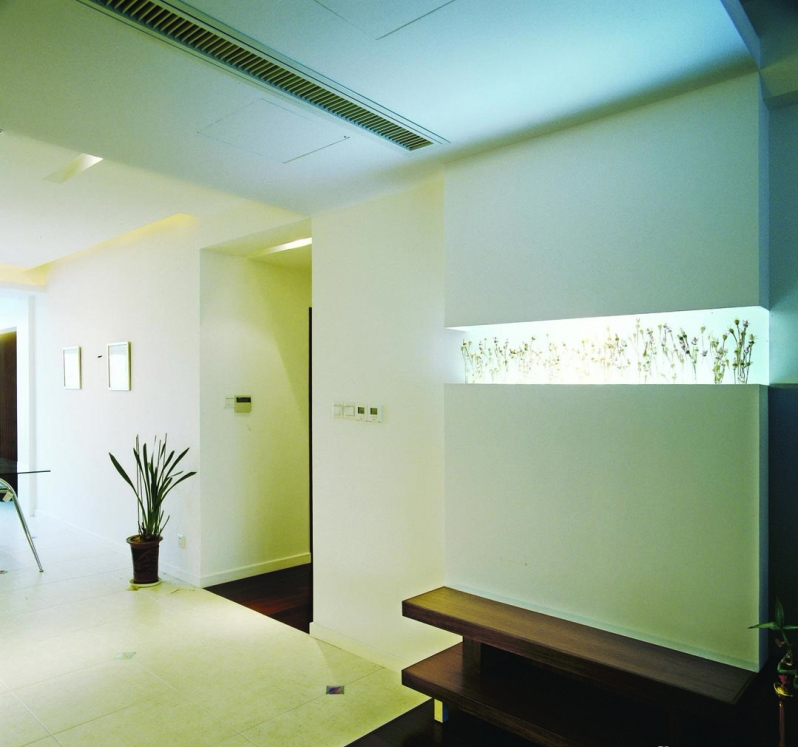 过道顶面的石膏板吊顶起到了延伸空间的作用。