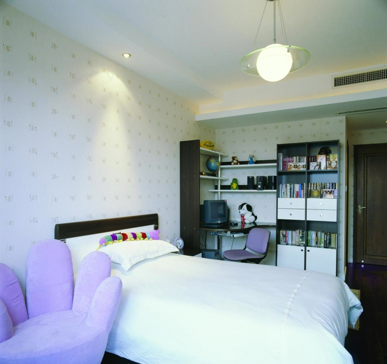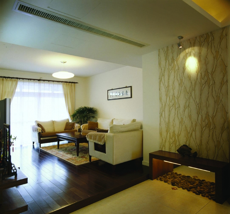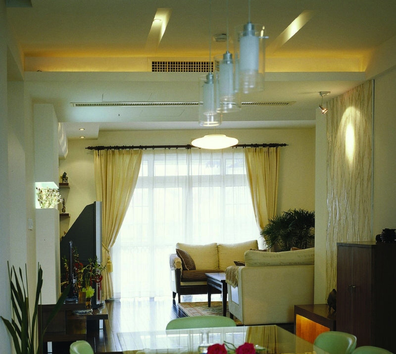 从过道开始,顶面的石膏板吊顶起到了延伸空间的作用,客厅与餐厅在地板与瓷砖之间的分区做的恰到好处;客厅的墙面以白色为主,橘色的灯光映射出厅内的低调奢华,客厅过来,墙面上粉饰着特殊的纹理,特意垂下的一盏灯光显得悠闲而惬意;走出客厅来到进餐区域,餐厅的一面玻璃背景墙被橘黄色的灯光衬托的温馨而洒脱,让用餐的情趣顿时增添了不少;主人平常有下棋品茗的习惯,因此屋内其中一间卧室被改成了茶室,房内中式风的木梁成了空间顶面的个性展示,与实木桌椅搭配的熠熠生辉;主卧的风格与家庭的整体风格相符合,简约中显示出主人的低调生活方式;儿童房里,充斥着各种玩具,家居小饰品,使得屋内增添了更多孩童的顽皮气息。