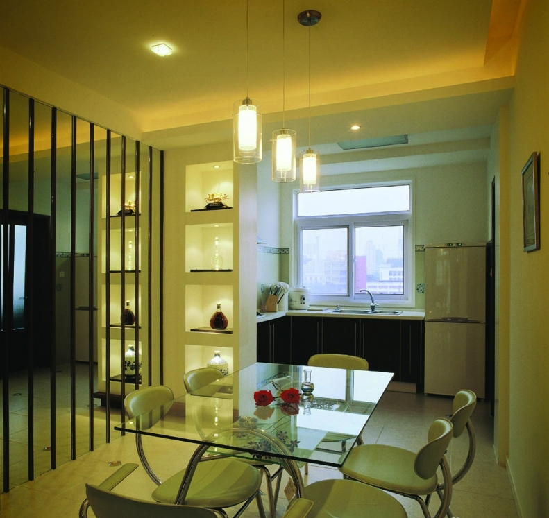 玻璃背景墙被橘黄色的灯光衬托的温馨而洒脱。