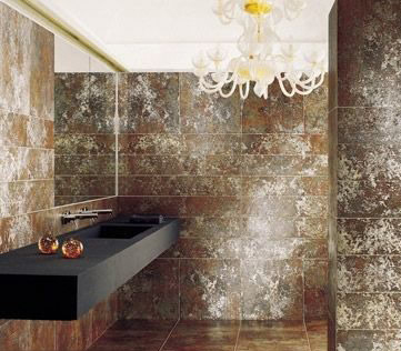黄色仿金属瓷砖,温暖的色彩和瓷砖斑驳的表面形成强烈的对比,瓷砖表面过渡自然的铁锈效果仿若天生,在墙面的铺贴方式上十分独特,中部采用小规格的瓷砖横贴,而上部采用和地面相同规格的瓷砖铺贴,在视觉上效果十分独特,和地面的整体谐调性更强。