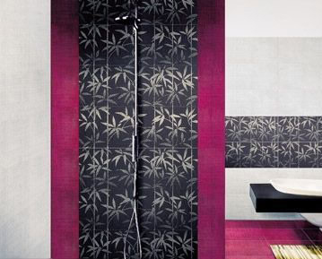 带有竹子图案的仿壁纸瓷砖,生动而格调高雅,壁纸的纹理效果和光泽被展现得淋漓尽致,竹子瓷砖在墙面上采用横贴和竖贴的组合方式,也显得更为有趣,搭配玫瑰色瓷砖,给卫浴带来柔美的一面。