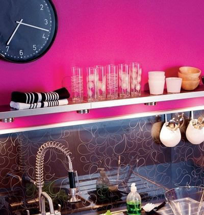 面积较小的厨房,一走进去就能感受到拥挤和狭小,加入一道绚丽的色彩来转移视线,用玫红色和印花深色瓷砖相结合,色彩分明的布局,会有扩大空间的效果。