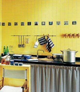 手绘图案小瓷砖和大面积黄色瓷砖相结合
