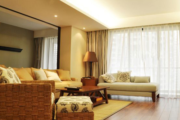 编辑点评:大地色系的布艺沙发,简洁线条的茶几和电视柜,以及竹制的挡帘,营造出清新淡雅的日式客厅。