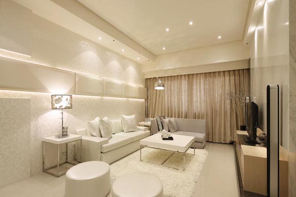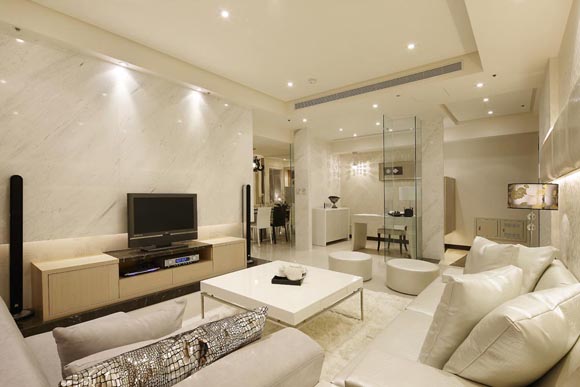 客厅区域以白色作主要的空间背景安排,以经典的彩度及间接光源的配置,重新展现欧式古典绝妙的雍雅及利落具层次美的场域精神。于沙发后方以亮质的皮革搭配裱布的方式,诠释出空间优质大器的意象,藉由材质质感的轻盈细致表情,勾勒全室的轩昂气度。主墙面藉由特殊的石材纹理做层次上的变化设计,搭配电视柜的造型做上下应对,成就空间内敛的视觉焦点。[page]