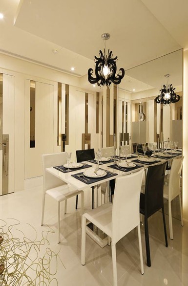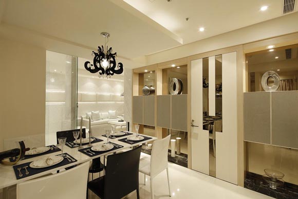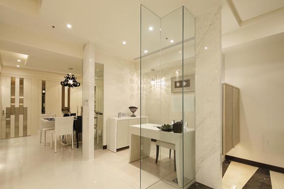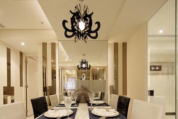 餐厅部分以茶镜、玻璃等反射材质,搭配木作作壁面或进入厨房区域及其他私密空间的隐藏门扉做ㄇ字型设计,具视觉延伸及放大空间的效果。透过黑色的水晶吊灯灯饰、间接光源,利落的安排出餐叙区域光影层次丰富的空间旨趣。书房系利用玄关的转折区域安排出阅读及延伸的空间感,全区以清浅的米色安排,延续公共空间的彩度基调。[page]
