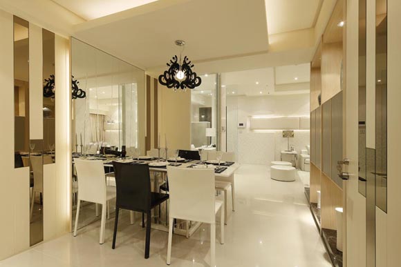 以茶镜、玻璃等反射材质,搭配木作作壁面或进入厨房区域及其他私密空间的隐藏门扉做ㄇ字型设计,具视觉延伸及放大空间的效果。