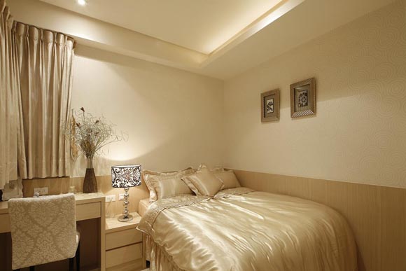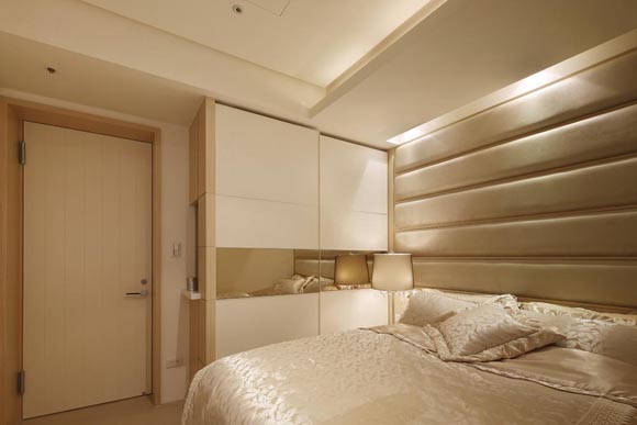主卧床头主墙设计以裱布规划,强调卧眠空间的优雅意境,也延续公共区域的古典语汇,铺述休憩的宁静氛围。卫浴区域以金属马赛克做墙面的腰带处理、加大明镜可以放大空间坪效、间接光源的运用,将五星级饭店的精致、细腻的使用机能及材质运用做完全的呈现。