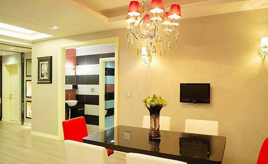 红色的吊灯,黑色的餐桌,白色餐椅让人感觉温暖。