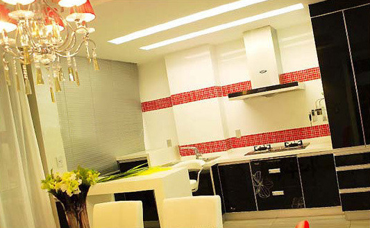 厨房餐厅敞开式的餐厅厨房也结合了红、黑、白色,空间中流动着同样的温暖,白色的厨房延续了红色的点缀,小空间里的暖意和生活的雅致情调表现的淋漓尽致。