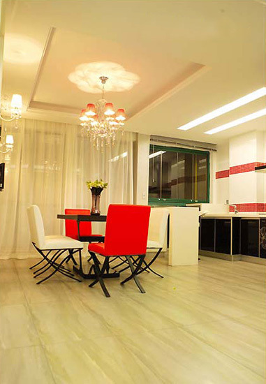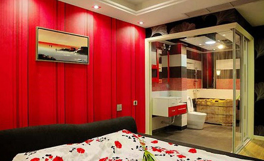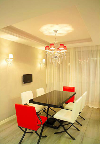 大块面积与小细节的红色需要调子的把握,在整体空间中的色彩应用做到:“延续色彩,充满色彩;统一色彩,不失色彩”。不是将红色宣泄到底,而是点到为止,张扬中更看见出奇的色彩和谐。