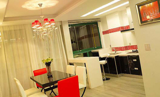 从客厅看餐厅,还是非常简洁的红,白,黑为主要色调。