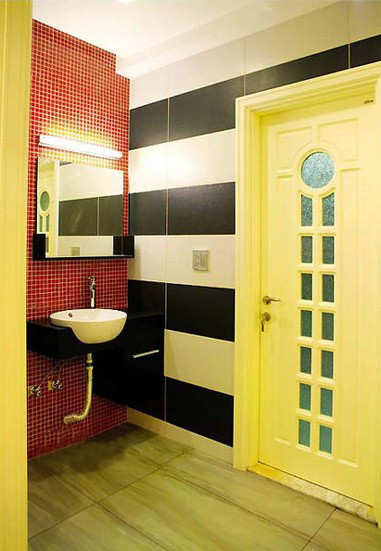 红色在这里以另一种形式出现。格子状的红色马赛克,配合黑白色的皮纹砖,使小空间也能丰富多彩。