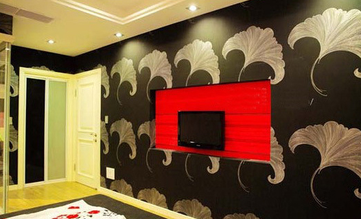 电视墙的简约化,可以在造型独特的书架上增加其生动的造型,在静中求动的做法就显的更具动感,黑色的墙纸,红白混搭的时尚椅,透出浓烈的年轻、现代、时尚气息。