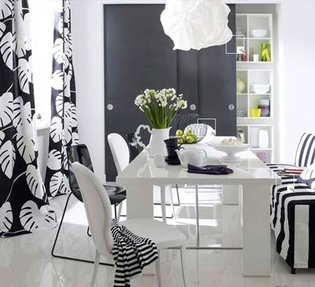 搭配点评:白色的餐桌椅,黑白间条的椅套,黑底白色图案的窗帘,黑色和白色的搭配营造了一个黑白分明的世界,空间色彩对比十足。