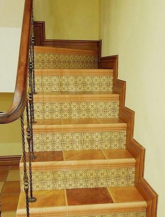 通往楼上的楼梯踏步上同样用仿古砖做了装饰,并用小花砖贴了侧面。与整体风格搭配,显得更加协调一致。