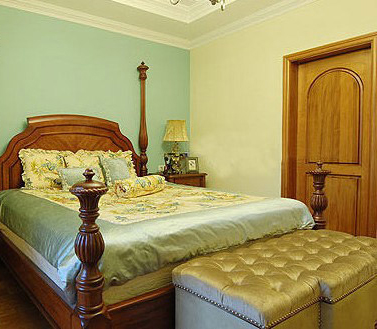 轻盈的蓝色装点主卧,搭配棕色木质仿古家具,显得高贵雅致。欧式宫廷风格的家具细节,搭配华丽的软包床尾凳,充满大气奢华之美。