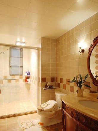 整洁的卫浴间同样采用了仿古砖的铺贴,温馨雅致的色彩,搭配仿古浴室柜,给人大气典雅的效果,与整体风格相得益彰。