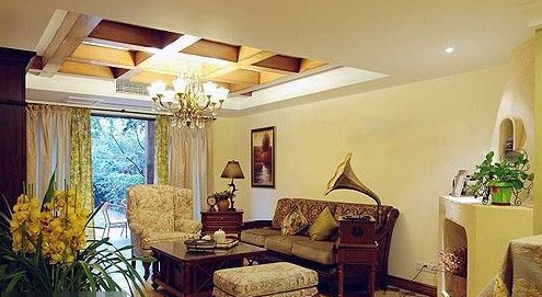 底楼的客厅,木格状的吊顶,给人自然的感觉,同时也与棕色木质仿古家具相呼应。米黄色的墙面给人阳光般的温馨感觉。