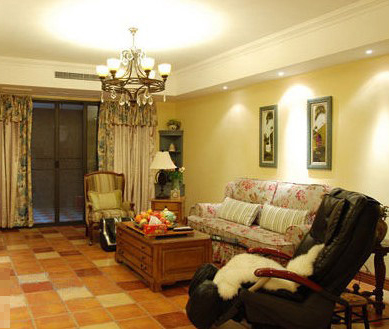 同样米黄色的仿古地砖,在客厅地面形成砖墙形式的错位拼贴,只在墙面与地面交接的围边部分用棕色和白色的瓷砖做了拼花效果。