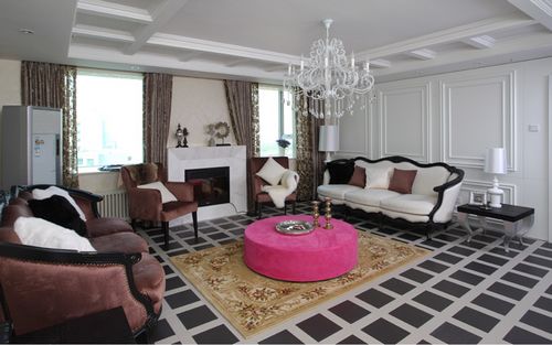 亮点:客厅中沙发、靠垫、茶几以及地毯等软装,都选用天鹅绒与皮毛材质,打好了贵气的基调,营造了优雅的氛围。而金属烛台、金属碟子、天鹅般的水晶灯、落地灯等饰品轻松装饰出了轻古典范儿。