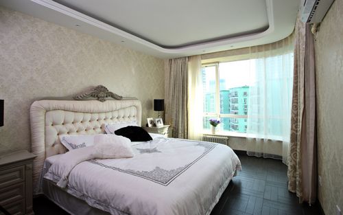 亮点:圆型卧室配复古欧式床,用色轻盈而优雅,淡金黄古典花型墙纸和同色系布艺窗帘,整个卧室融合为一体,美好氛围有助于入眠。