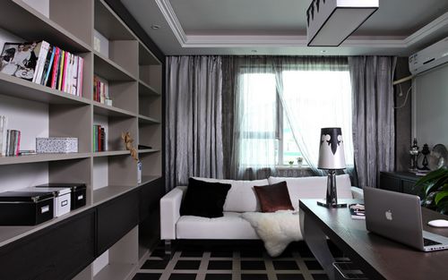 亮点:灰白黑家具颜色经典而庄重,书房的古典氛围一蹴而就。布艺沙发给严肃中带来柔和,摆一盆绿色植物,书房更让人舒适。