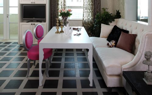 亮点:餐厅轻古典桌脚感坐椅和白色皮质沙发,搭配乳白花瓶组合和金色烛台,让餐桌气质典雅,在餐厅和朋友可尽享高贵用餐好心情。