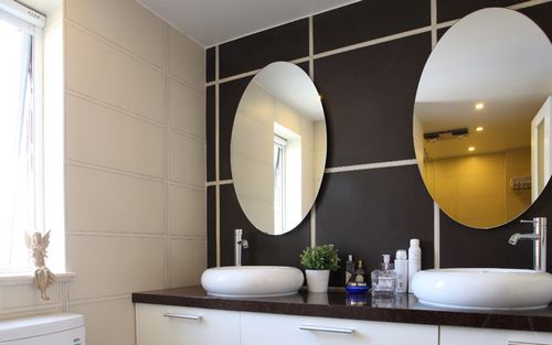 亮点:白色瓷砖墙面和咖啡色背景墙,让浴室颜色能量平衡,既不会让人感觉冰冰凉也不会太沉重,圆镜圆盆和让古典风潮无处不在!