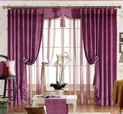 紫红色的丝绸窗帘搭配内里的粉红色薄纱,把高贵优雅的女性气质表现得淋漓尽致,两边半空撩起的帘子在风的摇曳之下又显柔美。
