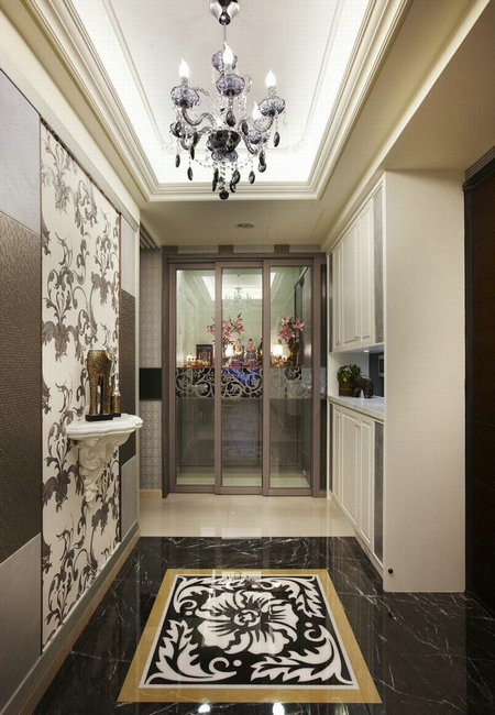 富含珍珠光泽的古典图腾壁纸,以对称壁灯架构大器格局,异材质点缀新颖又时尚。[page]