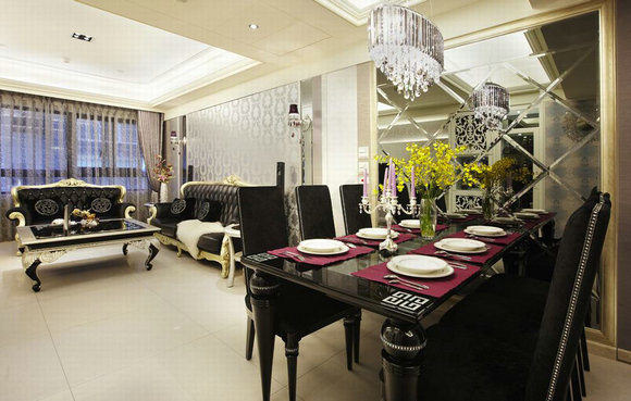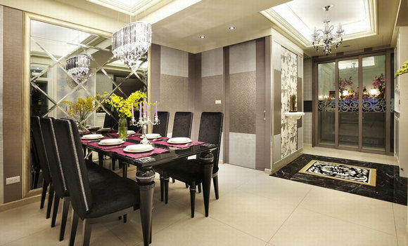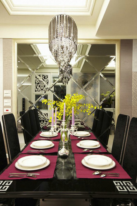 开放式餐厅,菱型灰镜反射出的景致,搭配灯光营造浪漫用餐气氛。