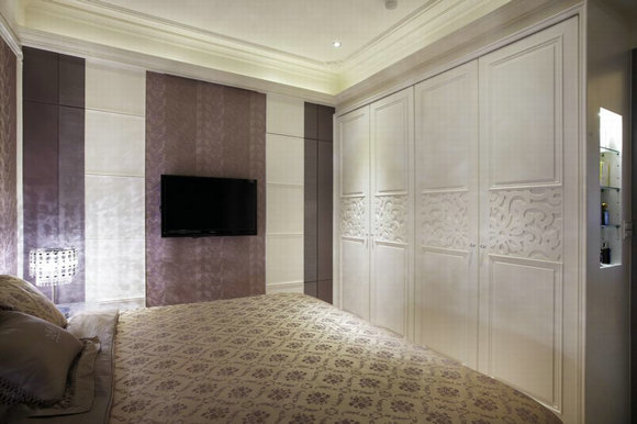 瑞士白自然纯净的大理石肌理铺述整面敞阔的主墙面,两侧对称的白色雕花柜体发挥了画龙点睛之效。