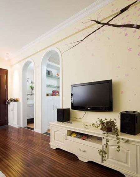 在客厅与厨房、卫生间过渡处,设计了两个对称的拱形门洞。既增加了端景的装饰效果,还将两处的门做了巧妙的掩饰。为了缓和过于简洁、硬朗的线条,位于同一立面的电视背景墙则用了手绘墙,为客厅增色不少。