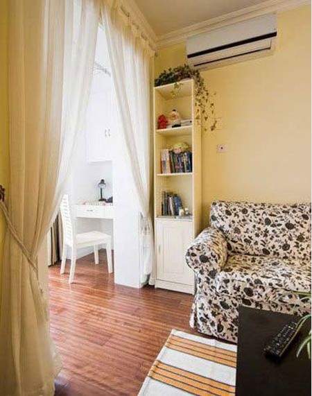 这里原是客厅的一部分,如今早已成了业主的书房。小巧却非常的实用,没有温婉的田园装饰。简约的线条配上松木的细致线条和白色的纱帘,一下提升了田园的感觉。