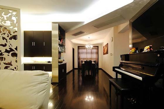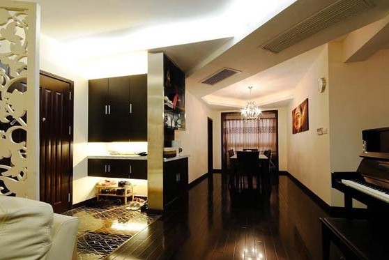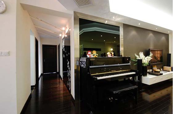 白色的沙发与钢琴都小露一个角,地板与墙面的柜体都是棕色系,由于是和父母住在一起,在装修颜色的选择方面也是比较简约大气的,设计上也以简单实用为主,穿插一点独特之处,就像门口地面的亮面地毯,让深色系的家不那么沉闷,也透着奢华!