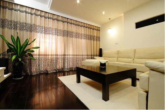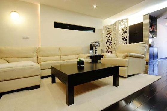 客厅,沙发区域。黑色的地板+白色的地毯。这款地毯是简单的织物,冬日可以增加居室的温暖,夏天也不像毛绒面料显热,总体非常清爽,茶几的中式的简单线条的木质,