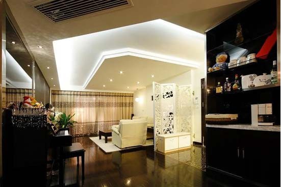 可以看到客厅那边的镂空屏风,做门口与客厅的隔断,自我感觉还蛮有品质的,客厅里没有设计吊灯,也没有一盏大的主灯饰,就靠这些筒灯完成照明任务了。