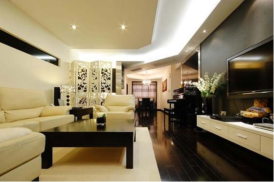 客厅的墙面,长形的黑色玻璃镜面设计,营造的奢华氛围[page]