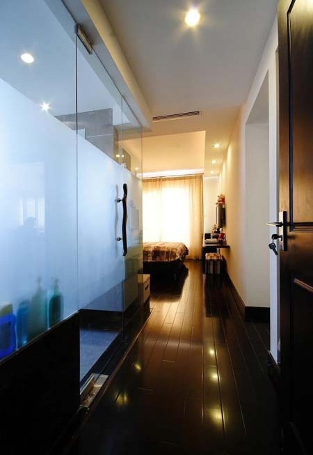 通向的是各个房间,楼廊转角是玻璃材质的镜面增加设计感,也延伸了空间
