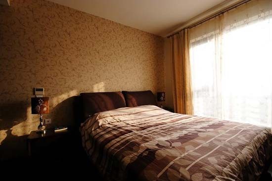卧室,纱质窗帘透进的暖光照在卧室有复古的感觉吧