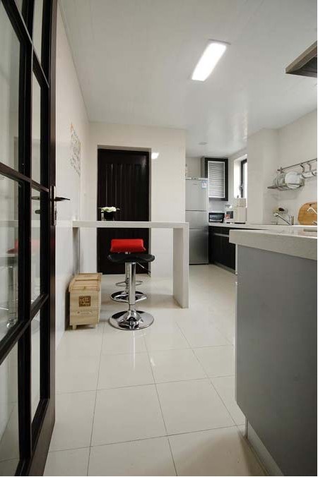 家里的墙面都是白色粉刷,入门的转角玄关做了一个吊顶,一方面是凸显整个家居的设计感,也衔接着客厅与餐厅的两个空间