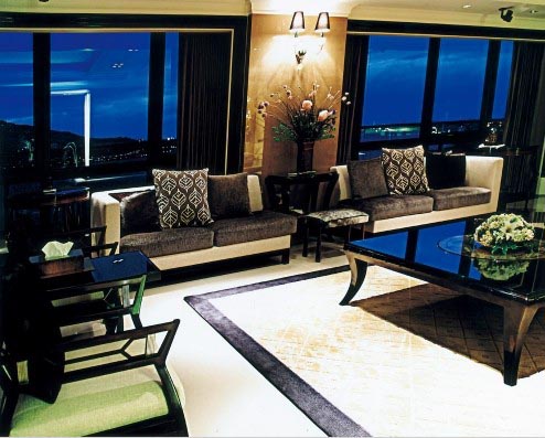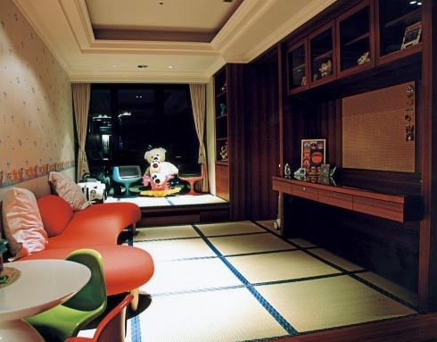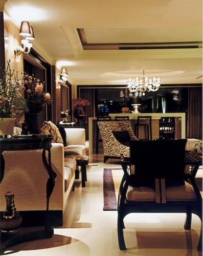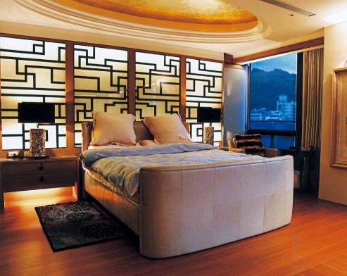 以中国语汇融入西方古典,退去传统老调意象,诠释建构出符合主人生活品味、个性气质的高雅气势,大面积连贯的落地窗,不以窗花式的中国意向规划,而仿制文华酒店深蕴内涵的手法,运用黑色线板,以画框式的表情设计,圈围满室低调而尊贵的氛围,天花以银箔的带状设计,加深光影对应的层次变化,空间里强调以订制家具为主角,壁面透过进口壁纸、石材修饰,简化过多的线条或颜色的配饰。