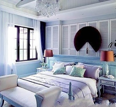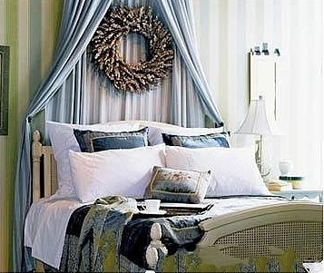 浅色的条纹墙纸、垂幔的床饰带出浪漫的风格,蓝色的床头柜、白色的陶瓷台灯,清爽的色调搭配在一起,让卧室风格鲜明。