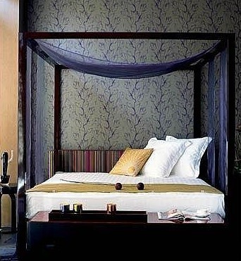 线条简洁的立柱床,富于个性又简洁大气,让卧室有宽敞的空间感,床尾几有光亮的色泽极富质感,透露着低调的华丽,空间线条也得到充分延伸,视觉上呈现出理性与感性完美结合,既优雅轻松,又井然有序。
