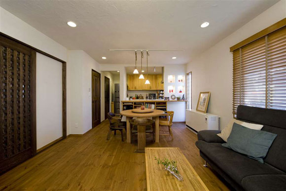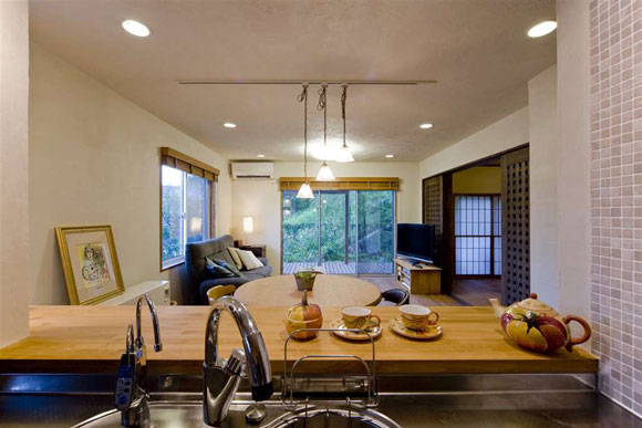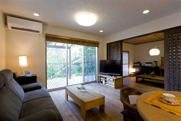 客厅给人十分宁静悠闲的感觉。窗外有雅致的日式庭院,绿树围绕,很清幽。客厅内有一个和室,给人另一种宁静之美。