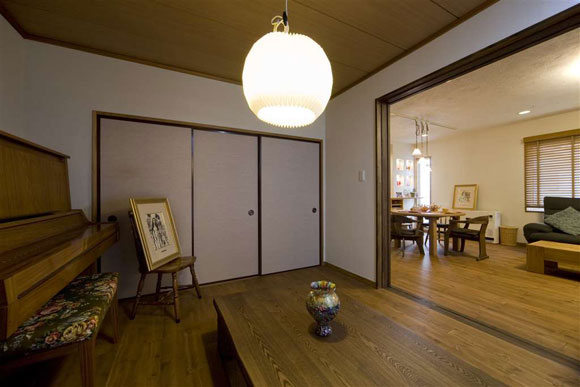 和室内采用和客厅同样材质的木地板,营造一种一体感。古式的钢琴,日式的纸灯罩,都充满着浓浓的旧时光的韵味。