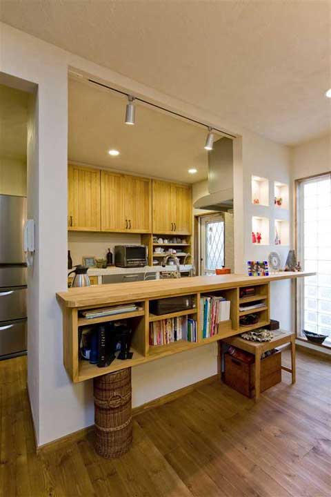 厨房外部打造了这样一个小型书架,可以放置食谱和杂志,方便翻阅。上方安置了射灯,增加气氛。