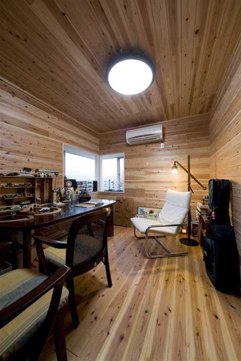 书房的墙壁均是用杉木板拼砌而成,飘着淡淡木香,充满大自然的气息。这里收纳着很多房主的收藏品,是不是很有一种“树屋”的感觉呢。